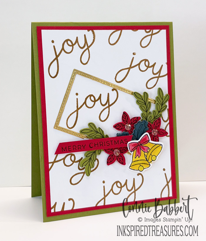 - A frame was cut with the Jolly Holly two rectangle Dies from Gold Foil Paper and adhered to the front so that one of the JOY greetings is featured.
