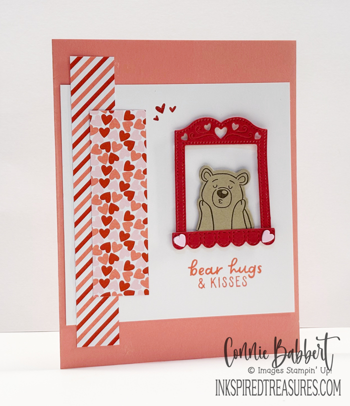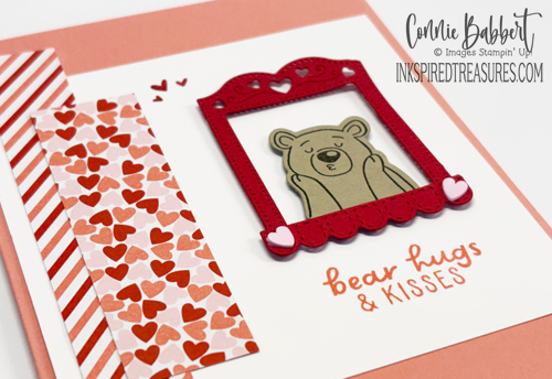 - The bear head was stamped with Early Espresso Ink on Crumb Cake cardstock and cut with the Valentine Kisses Die. It was added inside the frame with Stampin’ Dimensionals.