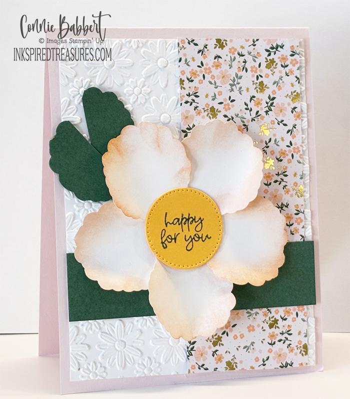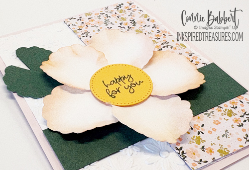 - The center is cut with the Stylish Shapes circle die from Golden Glow cardstock, stamped with the new Lily of the Valley greeting in Peaceful Pine Ink and added to the center.