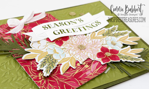 - The pine needle greenery from Christmas Greeney Dies was cut from Mossy Meadow, and cut in hlf, then tucked under the Poinsettia spray on each side.