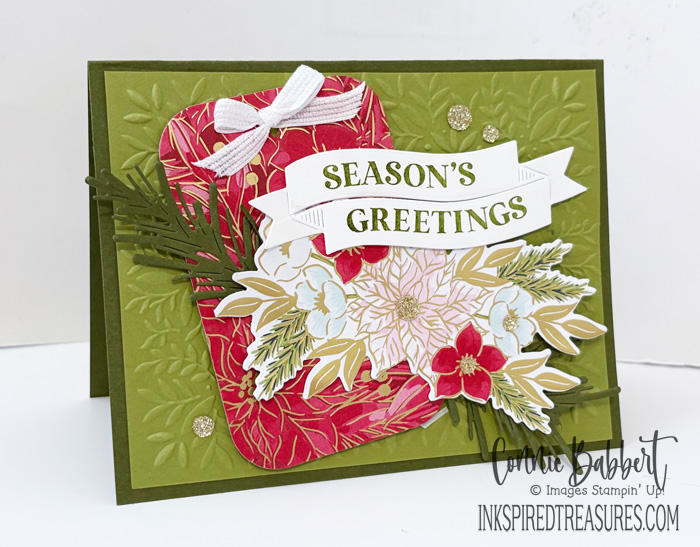 - The poinsettia spray from the Traditionals of Christmas DSP was cut with the Christmas Greenery Die and added to the front with Stampin’ Dimensionals.