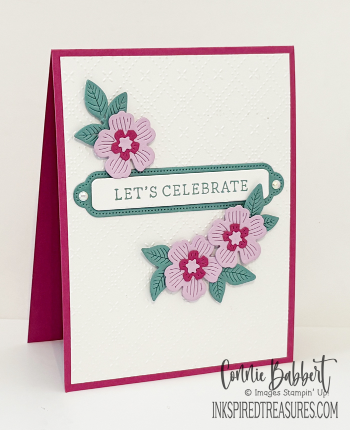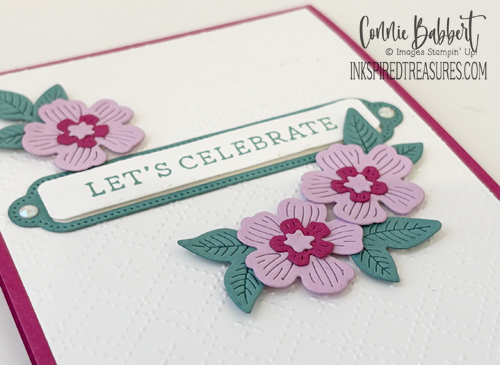 - The larger flowers were cut from Fresh Freesia, the smaller cluster flowers from Berry Bliss cardstock and the leaves from Lost Lagoon cardstock. The centers of the larger flowers were added over the Berry Bliss flowers. All were assembled on the front around the label with Stampin’ Dimensionals.
