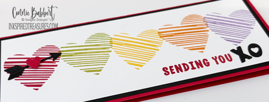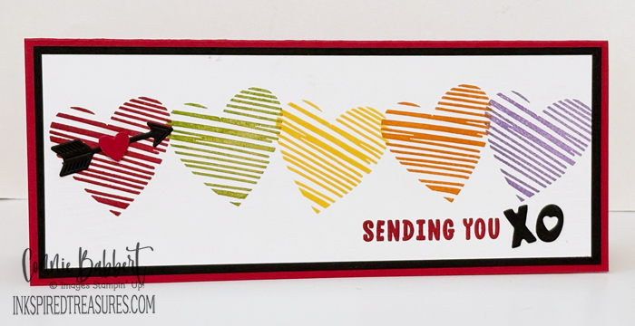 I love the little scribble heart in the Endless Love stamp set, so I used it to make a rainbow of hearts across my 3-1/2 x 8-1/2 slimline card! I used the contrasting black to make the colors pop!