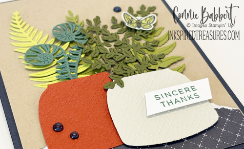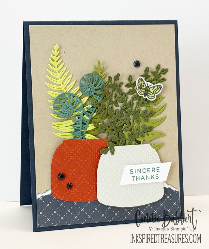 - The moth was stamped with Memento Black Ink on Basic Beige cardstock and colored with Lemon Lime Twist and Mossy Meadow Stampin’ Blends, then added to the ferns with a Stampin’ Dimensional.