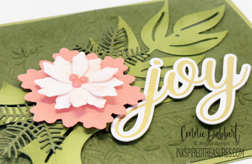 - Joy from Greetings For You Elements was added to the front with Stampin’ Dimensionals.