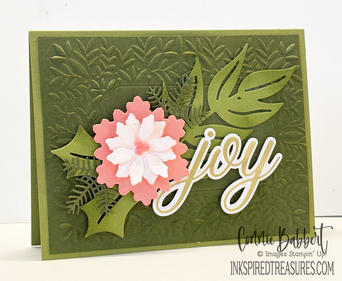 My mom received the most GORGEOUS peachy/pink poinsettia from her church group. I tried to recreate the color here! Absolutely no stamping on here…I used two different sets of dies and the Greetings for You pack again!