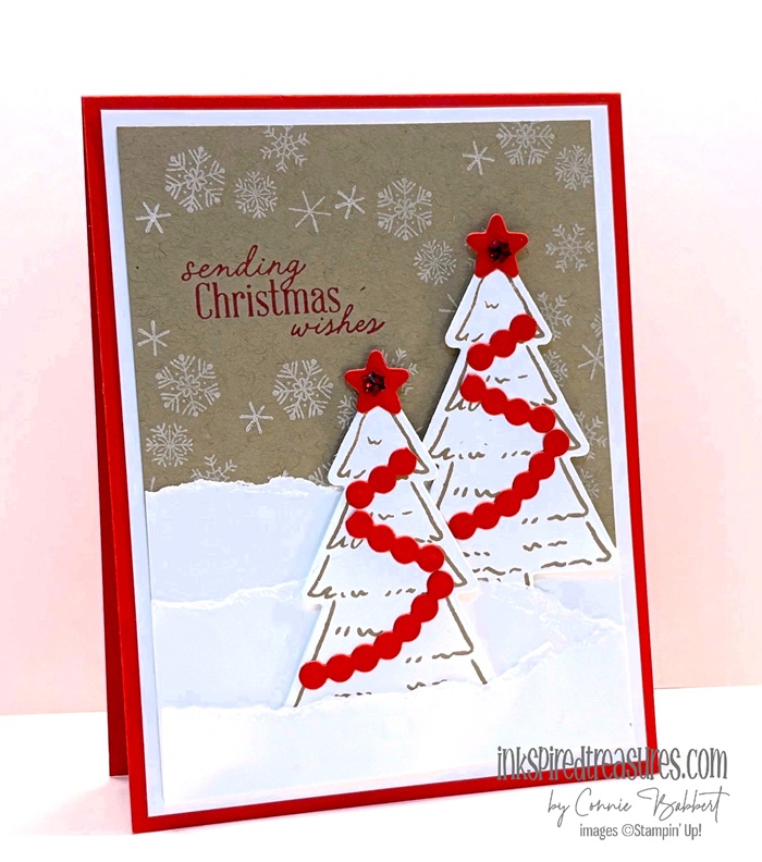 - Two trees were stamped with Crumb Cake ink on Basic White cardstock and cut with the Pine Tree Trimmings Die and added to the front with Stampin’ Dimensionals.
