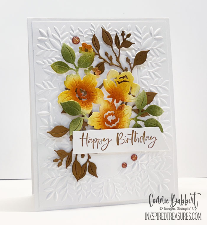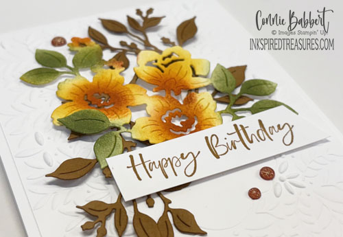 - The flower cluster was cut with the Charming Day Die from Basic White cardstock and colored with Crushed Curry, Pumpkin Pie, Cajun Craze, Old Olive Inks using Blending Brushes.