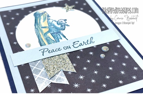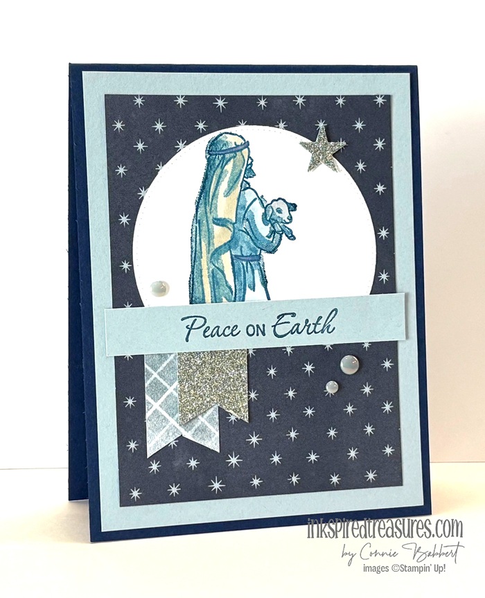 - The circle was cut with the largest Stylish Shapes Die and stamped with the shepherd in Night of Navy Ink. It was colored with Cloud Cover, Crumb Cake and Light Smoky Slate Stampin’ Blends.