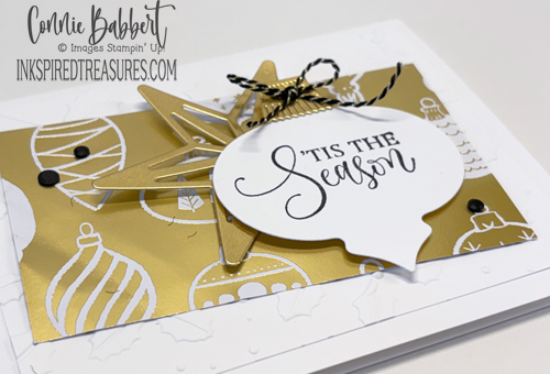 - The top of the ornament was cut form Gold Foil Paper and adhered to the top. The ornament was added to the front on top of the star with Stampin’ Dimensionals.