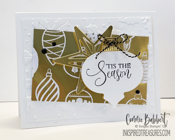 Accessories: Ornamental Christmas Dies, Jolly Holly Embossing Folder, Neutral Matte Dots, Black & White & Gold Twine, Adhesives