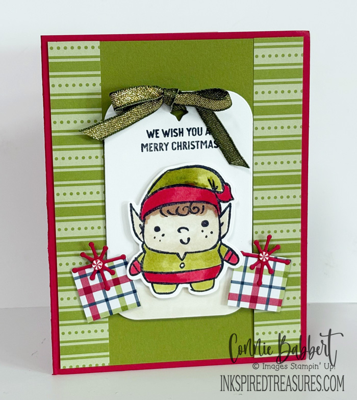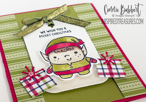 - The elf was stamped on scrap Basic White cardstock and colored with Old Olive, Real Red, Ivory & Bronze Stampin’ Blends. Cut with the Dies and add to the tag with Stampin’ Dimensionals and then to the front with more Stampin’ Dimensionals.