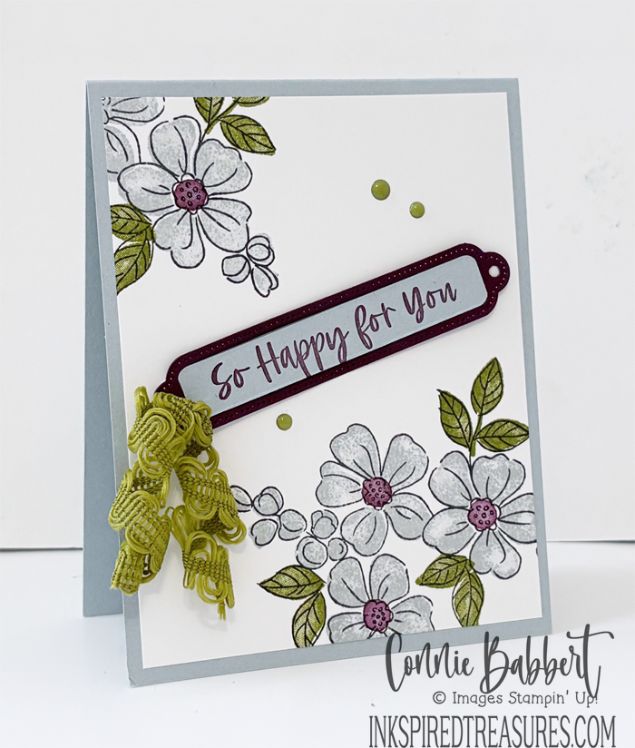 - Three flowers were cut with the Fragrant Flowers Die from Misty Moonlight cardstock, the cluster of flowers from Crumb Cake cardstock and the leaves from Mossy Meadow cardstock and assembled on the front. They were added with Stampin’ Dimensionals.