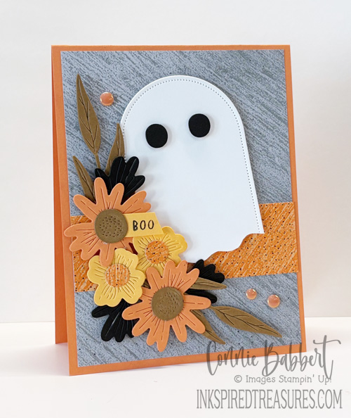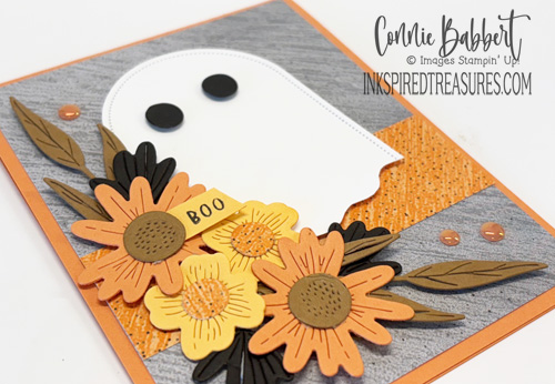 - The Impressions Abloom flowers were cut from Timid Tiger and Peach Pie cardstocks, the leaf stems and centers from Pecan Pie cardstock, the center of the small flowers from DSP and the other flowers from Basic Black cardstock using the dies. They were assembled next to the ghost and added with Stampin’ Dimensionals.