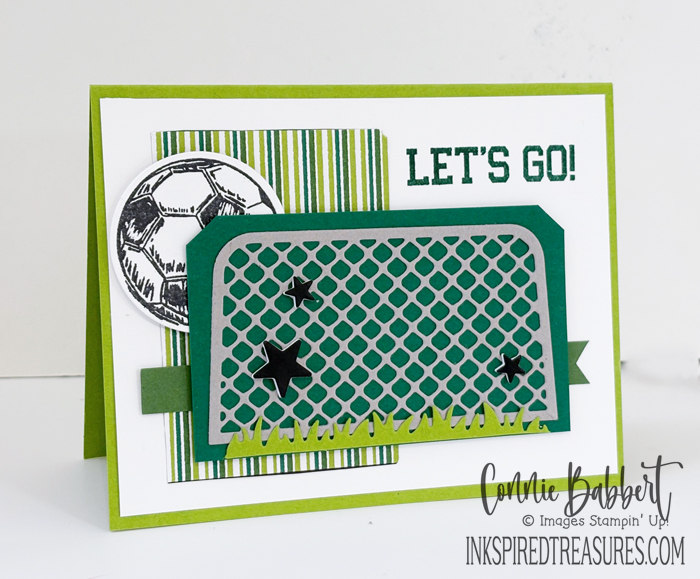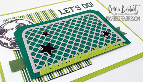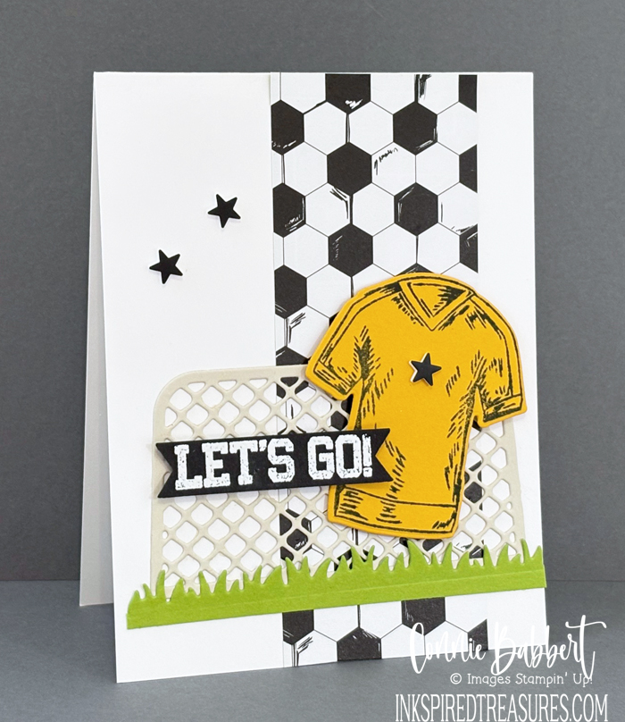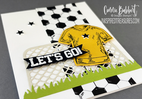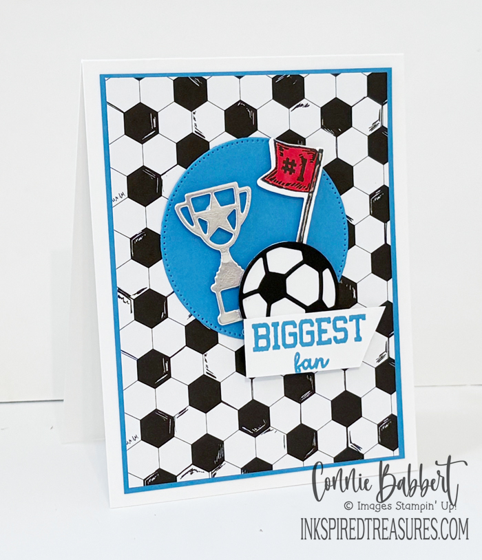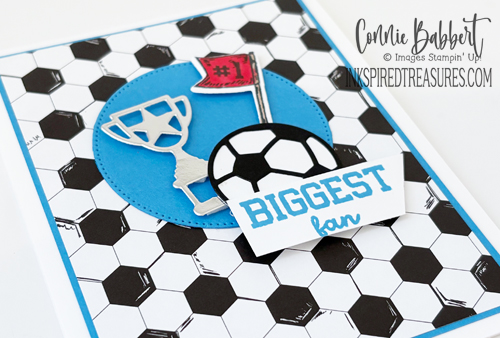 - The soccer ball was cut from Basic Black cardstock with the Die and adhere to Basic White 1-3/8″ circle (or trim around the ball itself). It was added with Stampin’ Dimensionals.