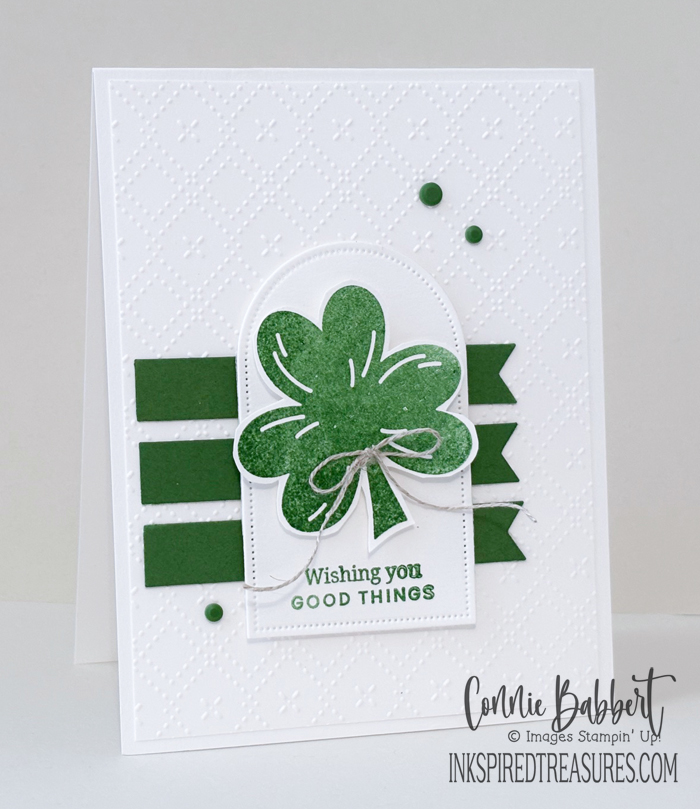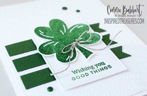 - The shamrock was stamped with Garden Green Ink on Basic White and hand-cut, then added to the arch with Stampin’ Dimensionals.