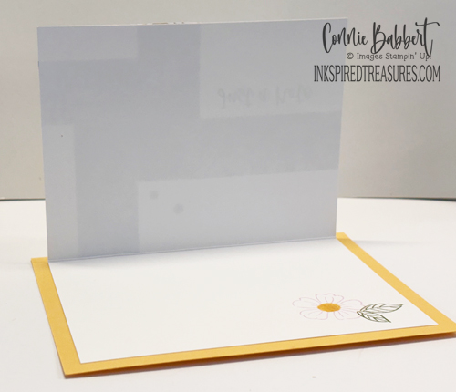 - The flowers were cut with the Dies from Daffodil Delight cardstock and the stem from Lemon Lime Twist cardstock, the little critters from Pool Party cardstock. They were all assembled on the front with Stampin’ Dimensionals.