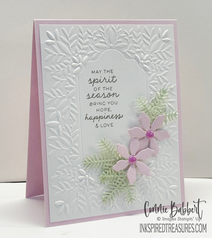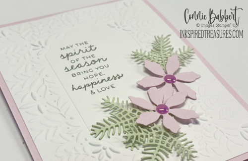 - Two of the pine branches were cut from Soft Sea Foam cardstock. The pine branches were cut in half, then three of them tucked under the poinsettia flowers.
