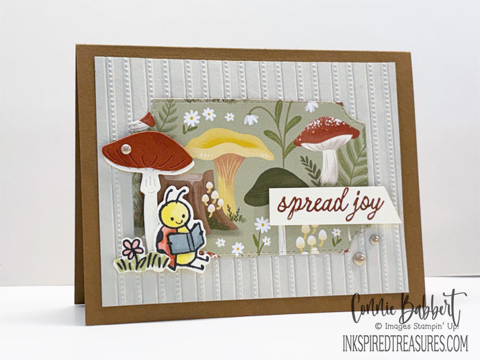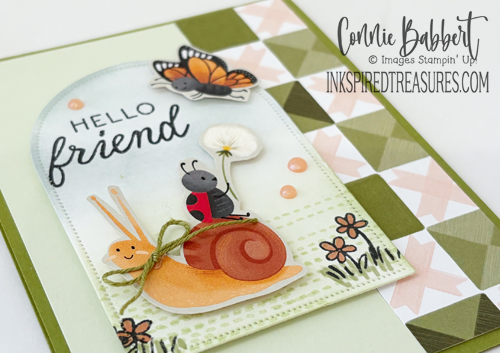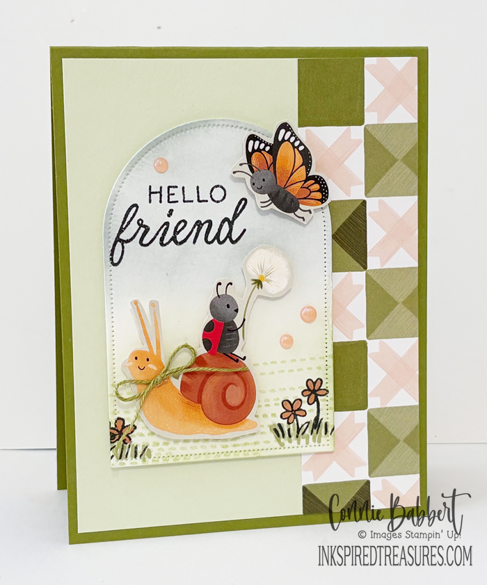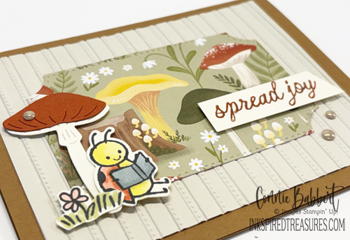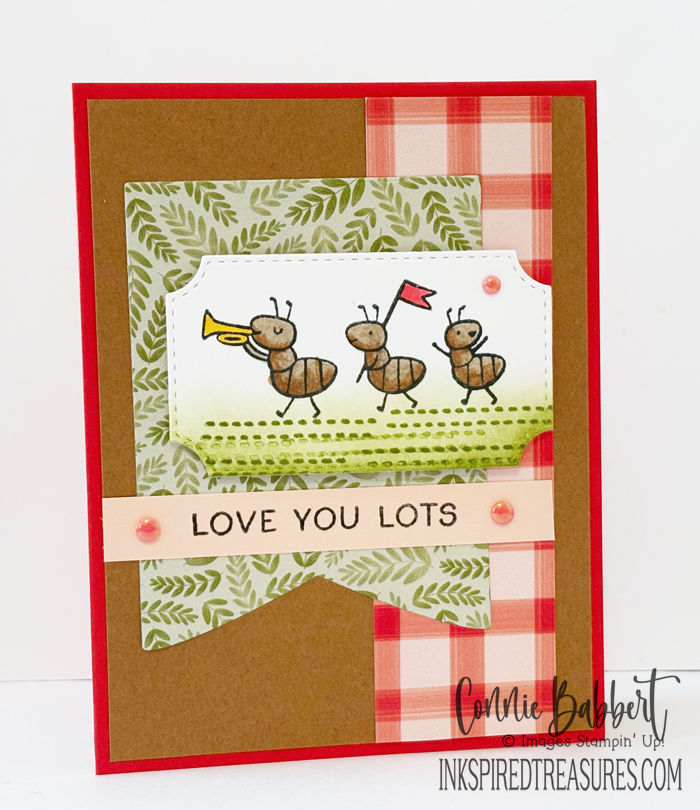 - The ants were stamped on the Branching Out die cut from Basic White with Memento Black Ink. The bottom was stamped with the dashed lines in Old Olive Ink and brushed with more Old Olive Ink. The ants were colored with Crumb Cake, Pecan Pie, Real Red and Daffodil Delight Stampin’ Blends. It was added to the front with Stampin’ Dimensionals.