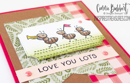 - A 1-1/4 x 5-1/4 strip of Cute as a Bug red check DSP was added down the right side.
