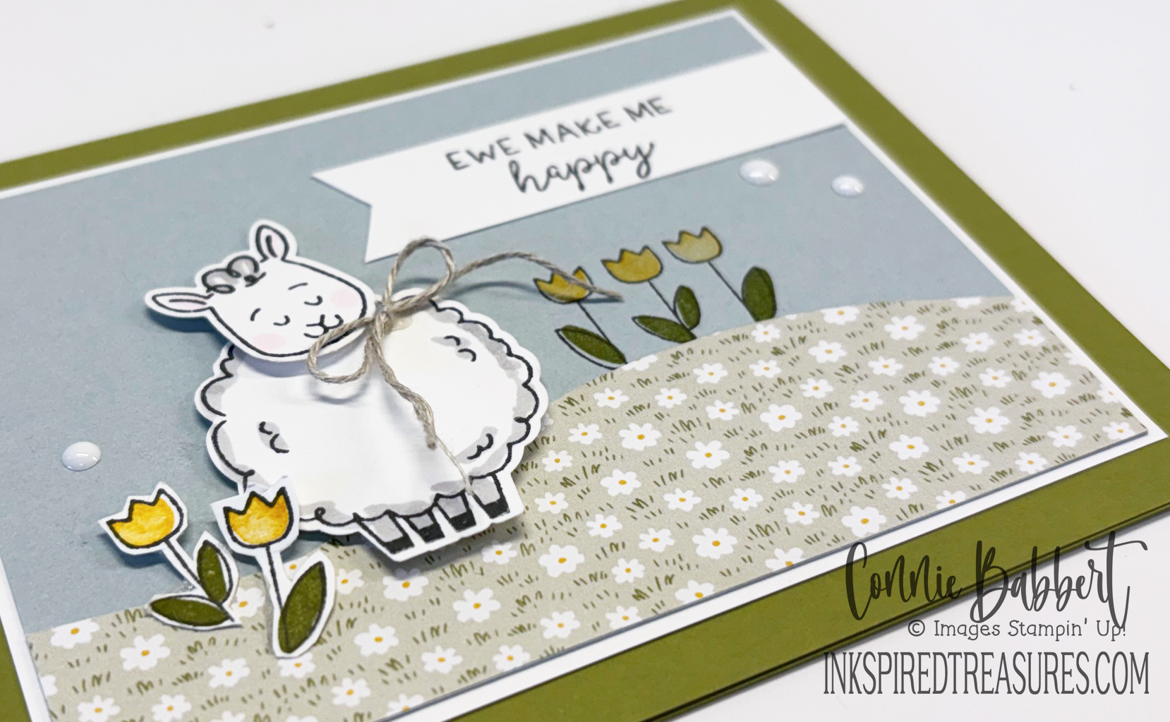 - The sheep was stamped with Memento Black Ink on Basic White cardstock and colored around the edges with Light Smoky Slate Blends, the cheeks with Light Bubble Bath Blends. It was punched with the Woolly Friends Punch and added to the front with Stampin’ Dimensionals. The cut flowers were added next to her with Stampin’ Dimensionals.